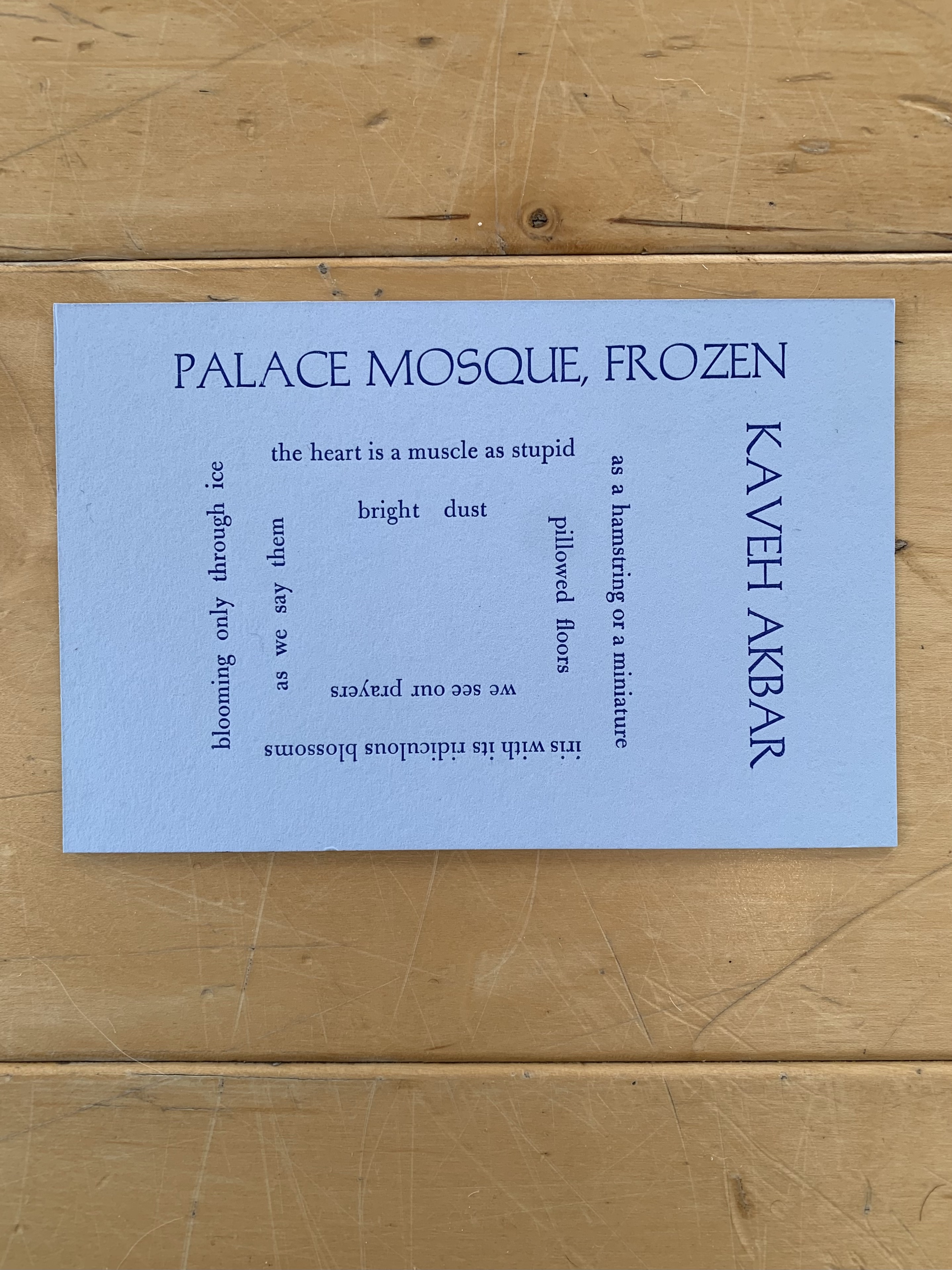 Kaveh Akbar's poems appear in The New Yorker, The New York Times, Paris Review, Best American Poetry, and elsewhere. He is the author of two poetry collections: Pilgrim Bell (Graywolf 2021) and Calling a Wolf a Wolf (Alice James 2017), in addition to a chapbook, Portrait of the Alcoholic (Sibling Rivalry 2016). He is also the editor of The Penguin Book of Spiritual Verse: 100 Poets on the Divine (Penguin Classics 2022). In January 2024, Knopf published Martyr!, Kaveh's first novel.